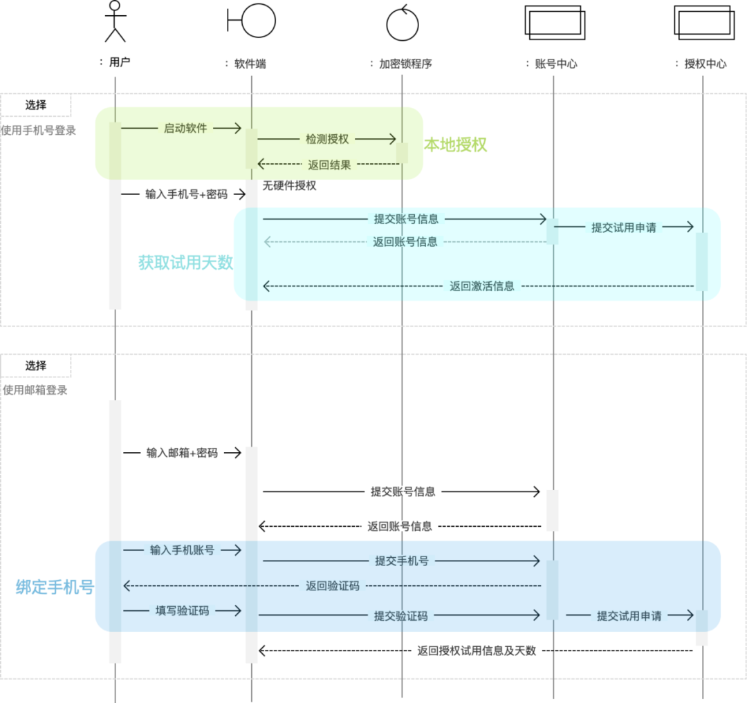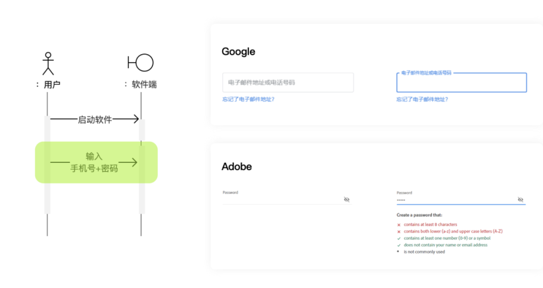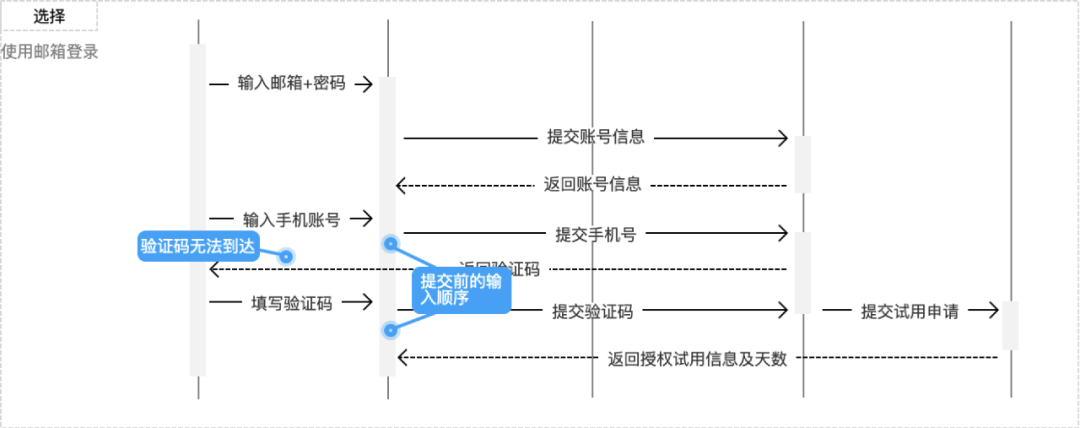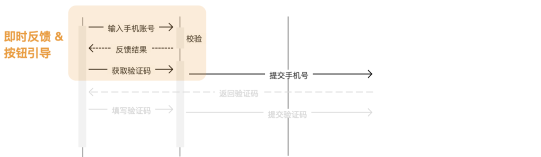 时序图会话的先后顺序也将直接影响到界面的表达,图示中“输入手机账号”与“填写验证码”是有先后时间顺序的,如果同时在界面中展示两个输入信息,无疑造成并列的误解。(可惜市面上几乎大多数注册环节都如此,大家早已习惯)
