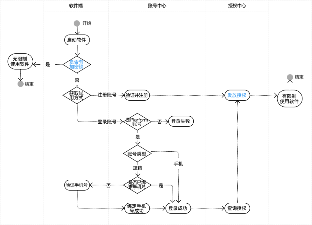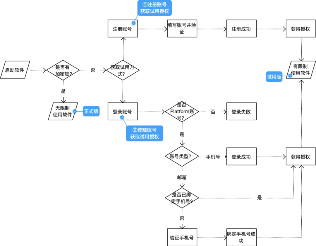 公司统一了Platform账号体系,在保证多设备产品端的一键畅通体验的同时,收集用户行为信息,以提供更精准的售后服务。同时与授权中心合作,通过网上商城定期开展活动,以下放试用天数,获得试用授权。产品经理与销售部门达成持续的合作,通过试用用户的手机号进行电话回访,提高购买转化率。同时软件的设计应能最大限度的提升客户自发购买行为,需要在何时的时机,合适的位置提供购买入口。