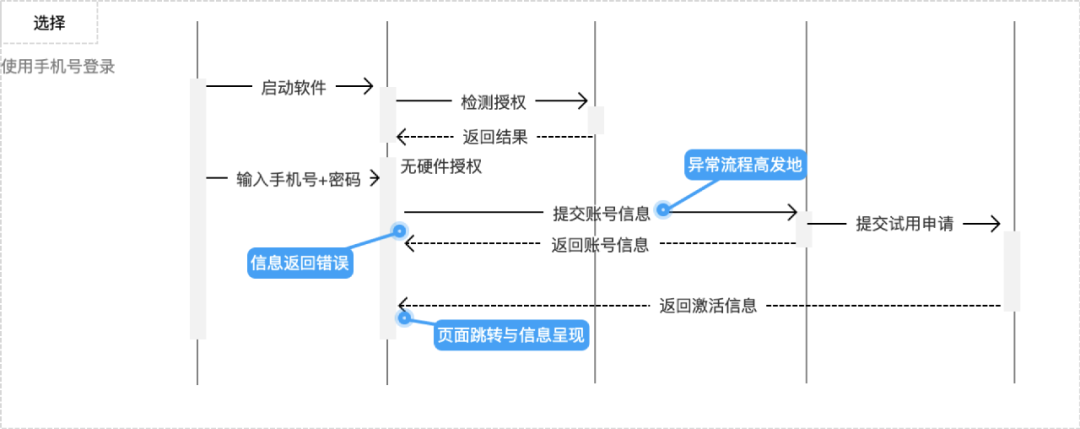 最后一步是对支线、异常、极限情况的排查,得益于时序图系统行为的可视化表达,我们可以清晰、有序的排查每一个对话过程中可能出现的异常或错误,诸如“验证码无法到达”、“信息返回错误”等异常,都将被有效地排查出来。同时,还能从行为对话结构中,洞察到新的设计优化机会点,诸如“提交账号信息”环节,必然需要网络的通畅,故断网环境下需要给出明确的反馈。如下示例:信息返回错误、异常流程高发地、页面跳转……