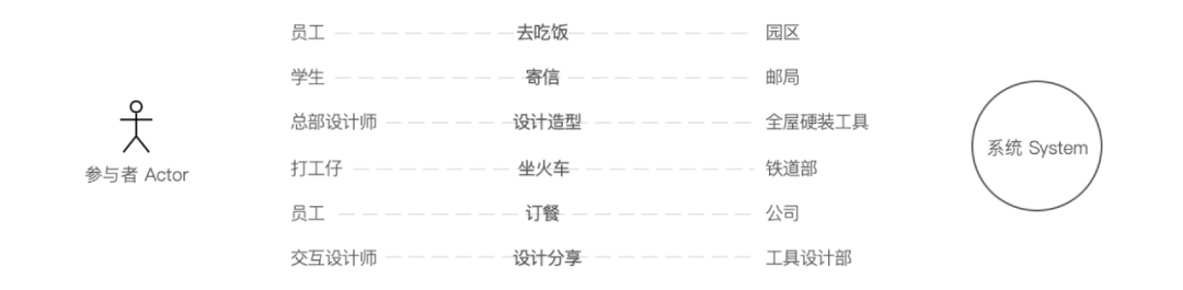 可以发现,一个用例以一组活动集合来表现,集合中包含两个角色,参与者、系统。参与者是“活的”(不一定是人类),TA的诉求驱动了这一系列活动,此诉求即用例的核心,也是价值的体现。一个参与者可以对系统有多个诉求,详见如下案例: