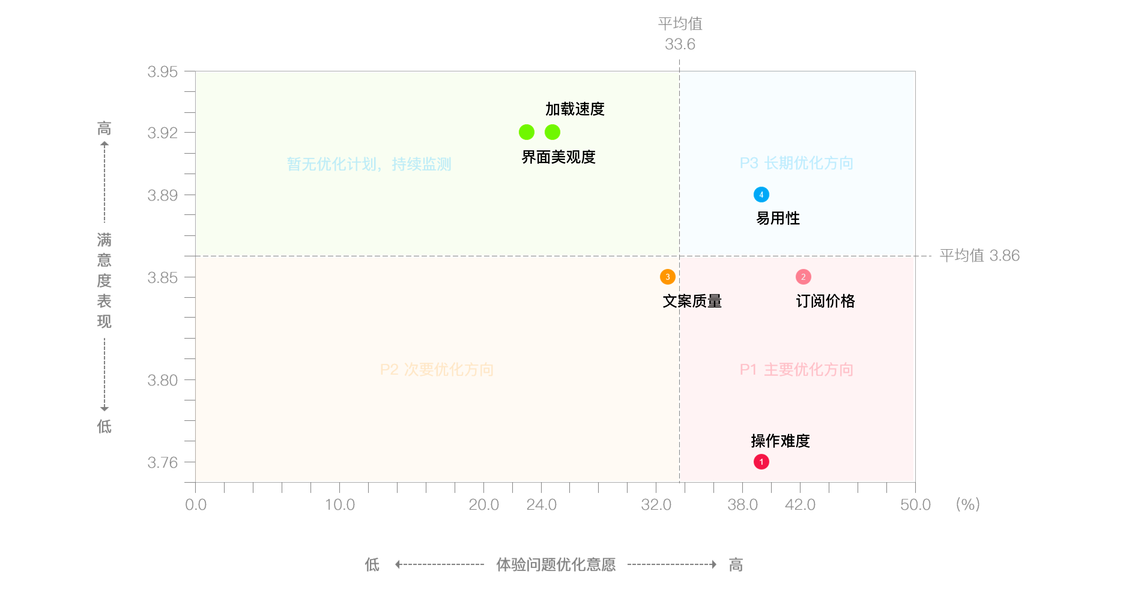 k值反映出该自变量对因变量的影响程度。这一方面可为我们设计决策指明方向,结合每个自变量的当前值的现状,确定发力的方向。如下是一份“优化意愿-满意度值”矩阵图表。可以明显发现“操作难度”、“文案质量”因子本身数值低,且优化意愿高,假设我们在某6个月周期内,预期提高 △xn的数值,结合kn的数值,进行量化计算:△yn=△xnkn > △ym=△xmkm ,在决策上,则倾向于 n 自变量。这将为体验设计构建一项坚实判断基础,使相关工作有据可依,有条不紊。